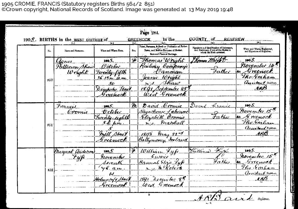 Family of Francis CROMIE and Elizabeth STEWART